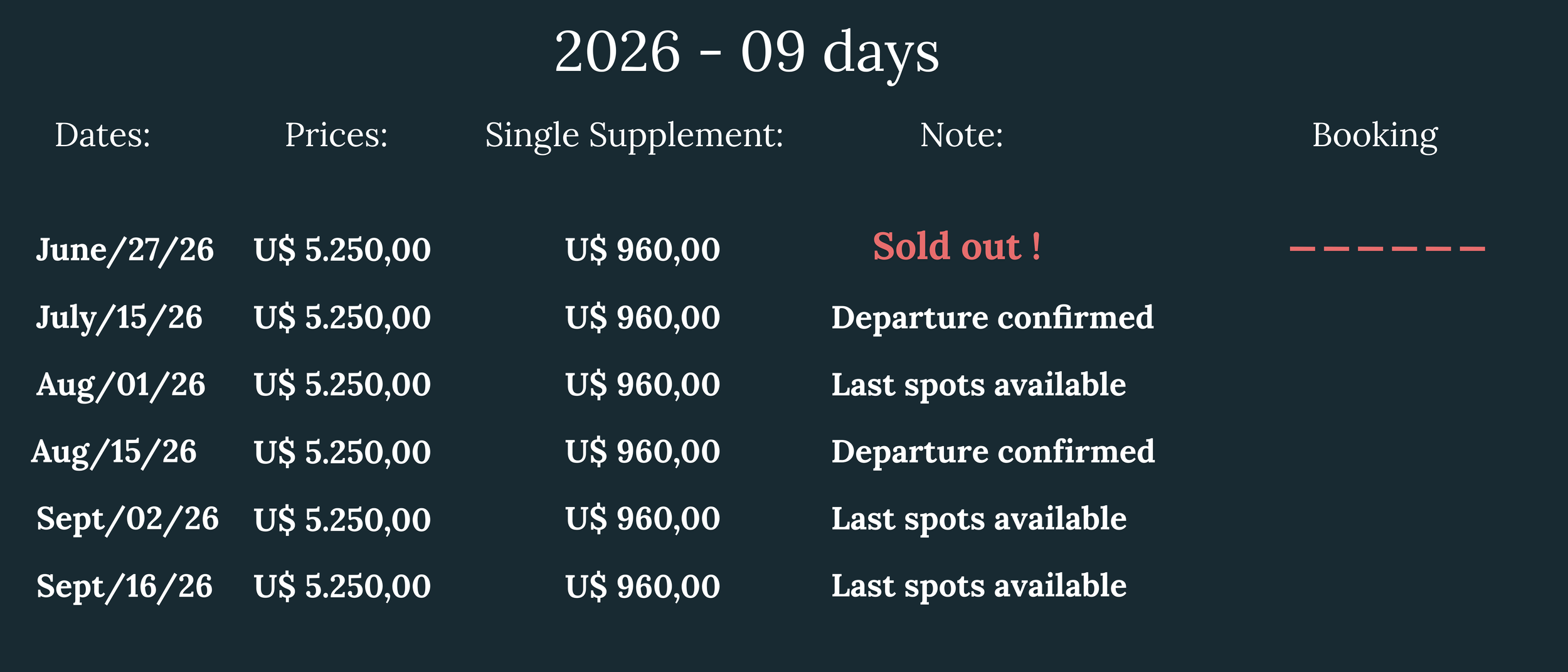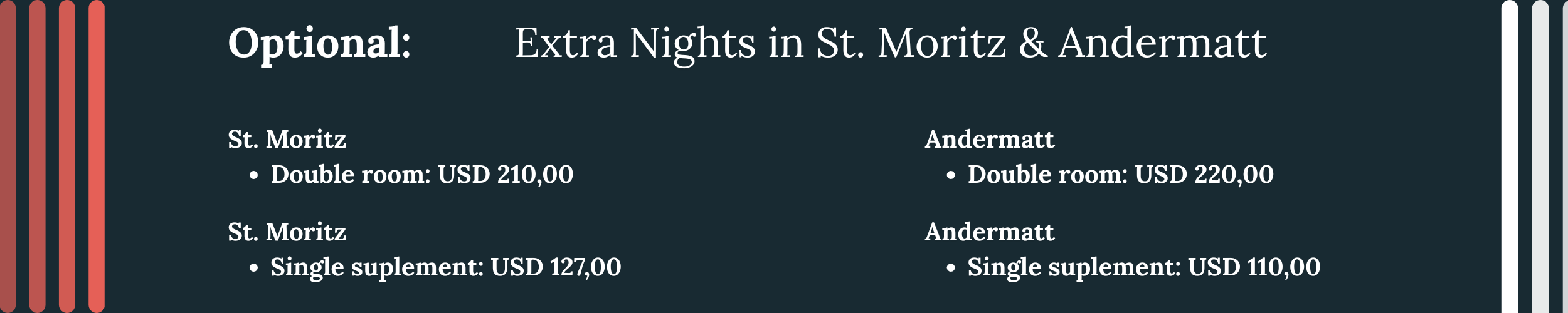 Prices per person in Double Room - currency: USD
